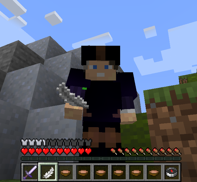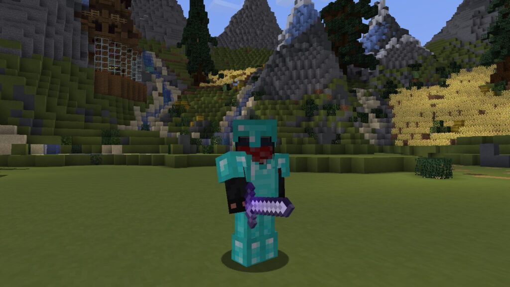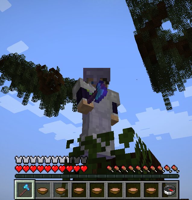 Este kit contém: capacete e peitoral de ferro, calça de couro (Proteção contra Projéteis 4, Inquebrável 1) e botas de couro (Queda Suave 4). Espada de diamante (Afiação 1) e sopas.