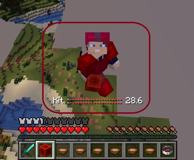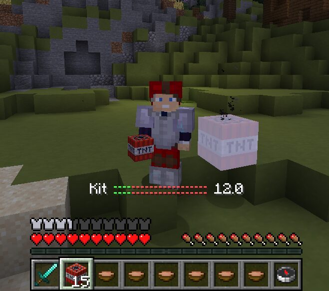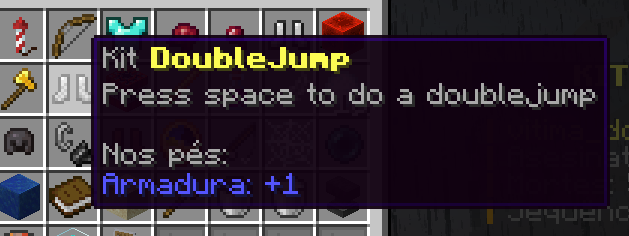 Este kit contém: Armadura de ferro (Armadura de couro vermelha durante a investida(Proteção 3)), espada de diamante, bloco de redstone e sopas.